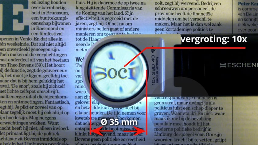 Een lens vergroting van 10x is prima om details beter te kunnen bekijken, echter teksten lezen is eigenlijk niet comfortabel. Hoe hoger de vergroting, hoe meer randvertekening.